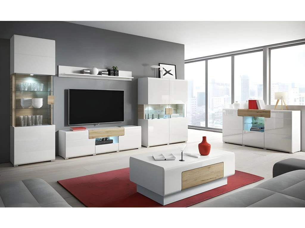 – COLORIS : Corps du meuble couleur blanc. Façades blanches brillantes. Façade tiroir effet chêne.