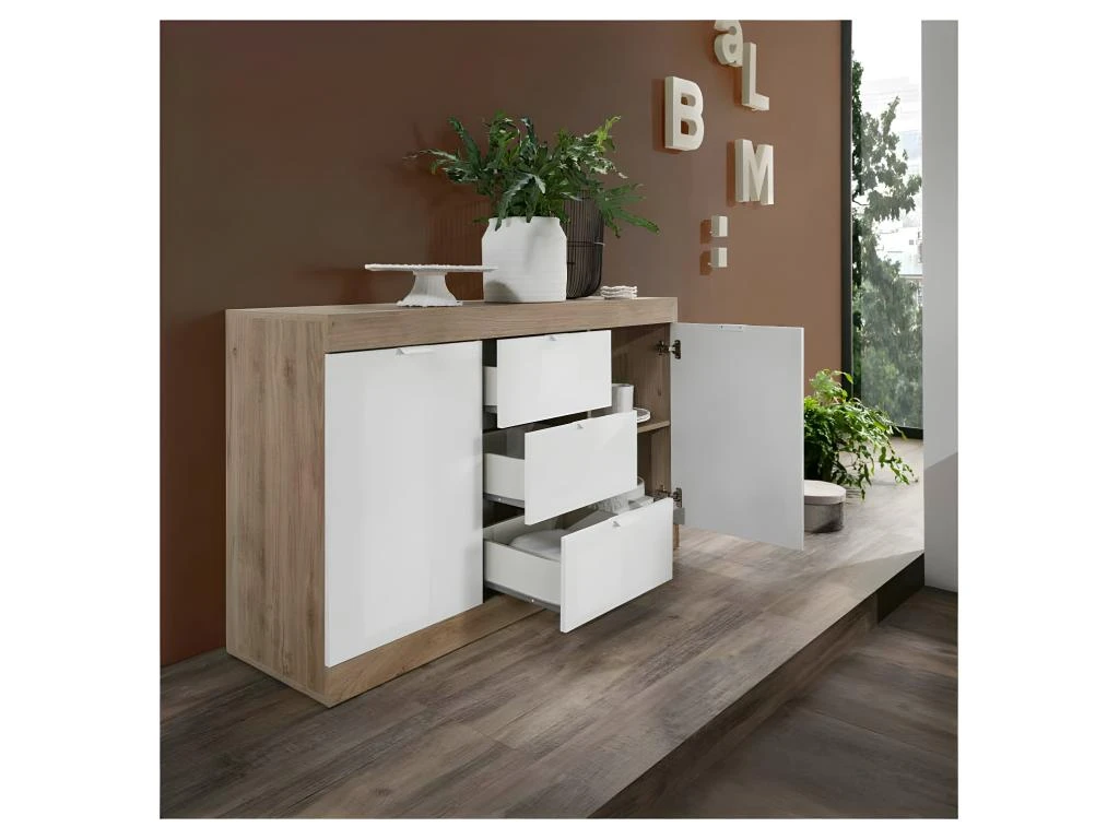 Mettant en avant des ouvrants laqués blanc brillant et des traverses revêtues d’une finition Chêne naturel au rendu plus vrai que nature cette belle enfilade à la dimension optimisée promet de moderniser sagement votre coin repas.