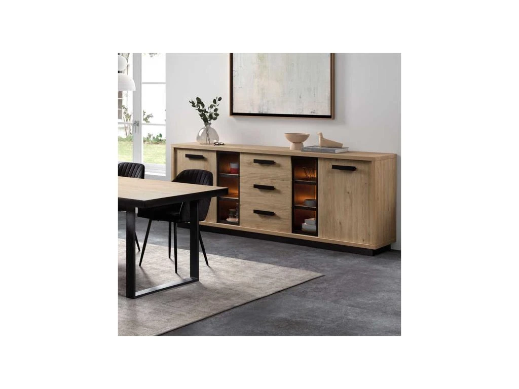 Mariant une finition Bois clair au rendu très probant et des empiècements façon béton ciré foncé cette enfilade de grande dimension bénéficie néanmoins d’une légèreté visuelle satisfaisante.