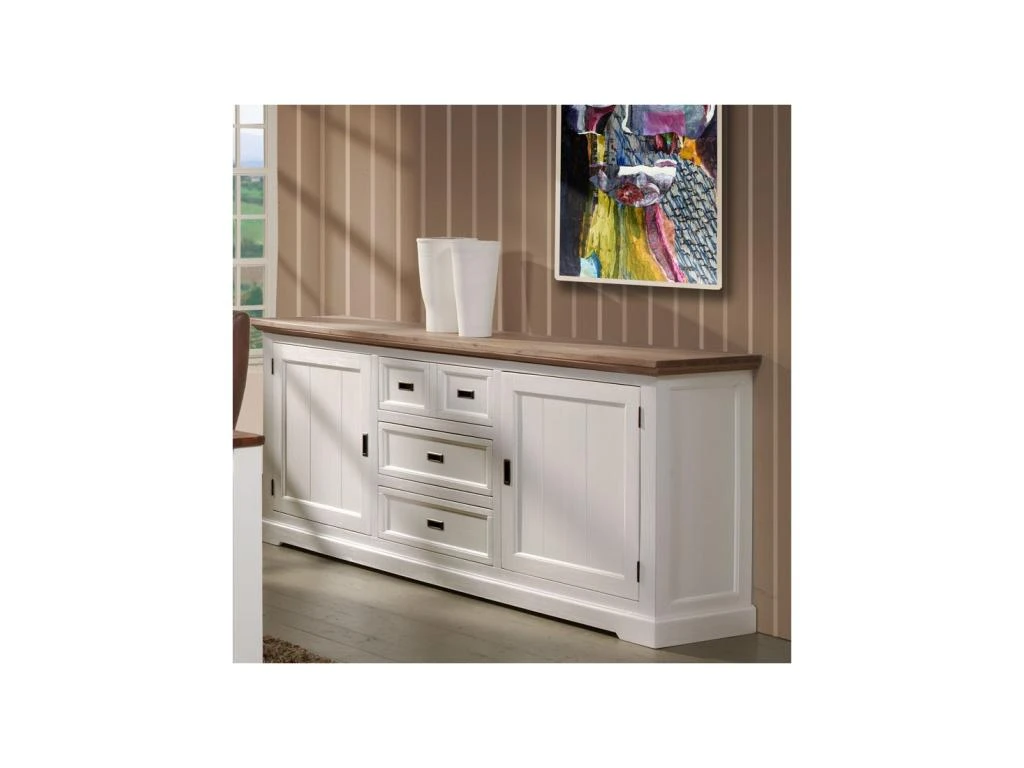 RĂ©alisĂ© en bois massif teintĂ© blanc, ce buffet donnera Ă votre salle Ă manger l’ambiance d’une maison de bord de mer. Le bois prend tout son volume avec cette teinte lumineuse.