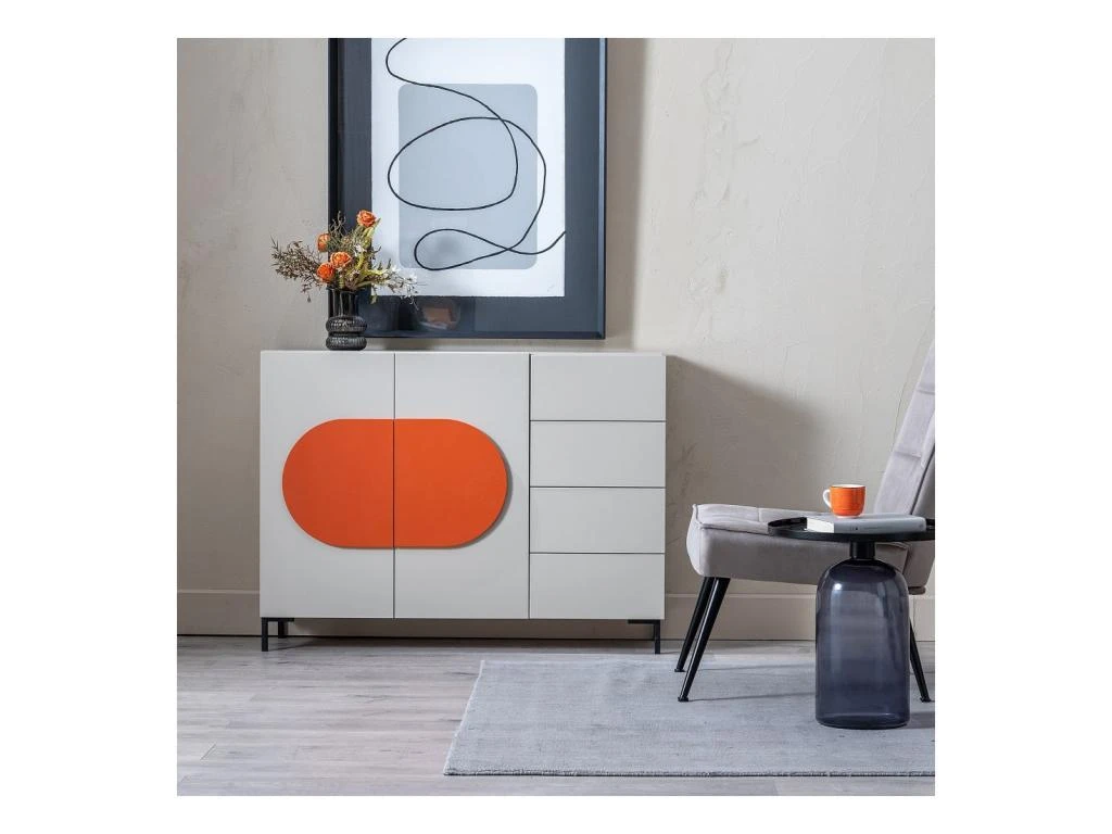 Malgré son look hors du commun ce meuble de rangement sait se marier à un ameublement hétérogène grâce à ses lignes minimalistes et son code couleur Taupe mis en relief par un empiècement teinte Orangée.