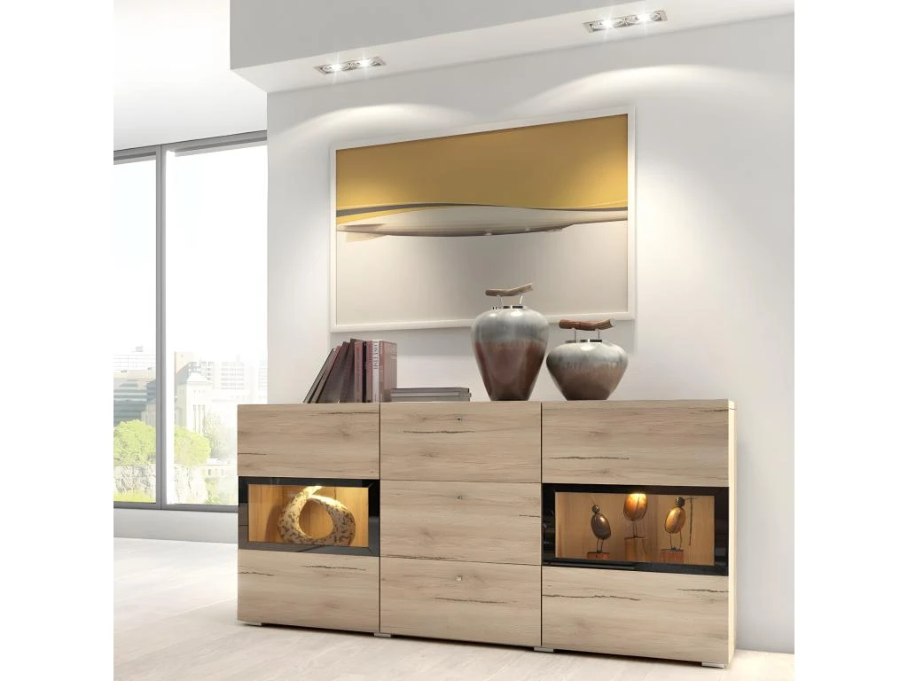 Offrez à votre salon un style unique au top des dernières tendances déco grâce à ce buffet de la gamme RAMOS ! Ce buffet est composé de nombreux rangements à savoir : trois tiroirs et trois portes avec une partie vitrée. Ces vitres vous permettront de mettre en valeur vos objets déco.