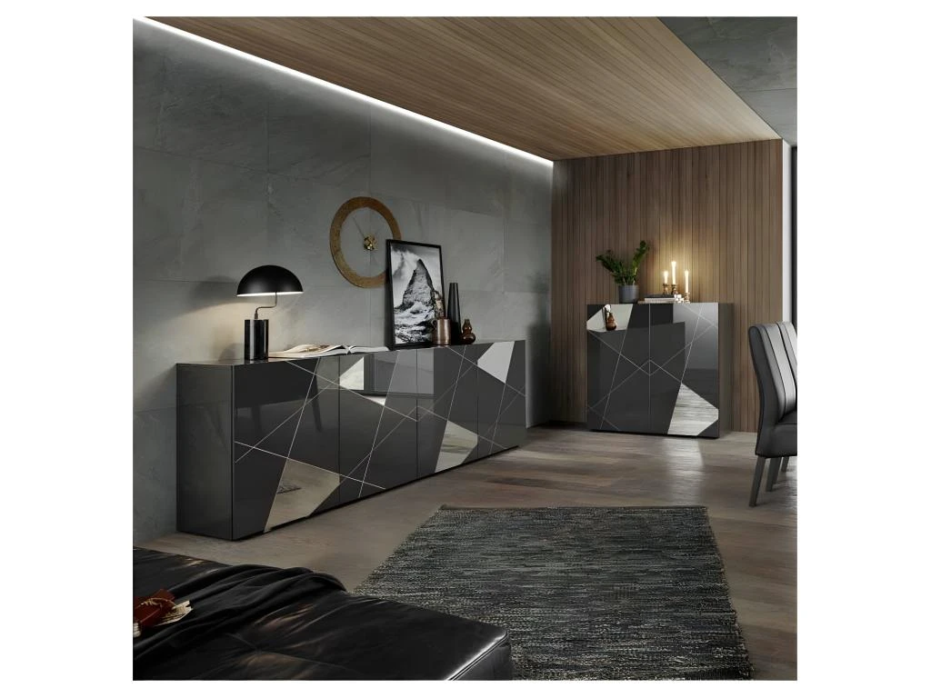 Cette grande enfilade minimaliste revêtue d’une laque gris Brillant est mise en volume par une sérigraphie géométrique et par des empiècements miroir, elle vous permettra ainsi de structurer votre salle à manger.