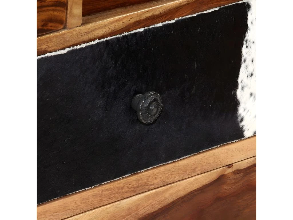 Ce buffet unique est riche en éléments décoratifs, comme les véritables détails en peau de vache, les décorations sculptées à la main et les tirettes de style rétro, qui donnent au meuble son charme unique.
