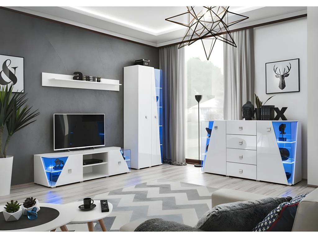 Offrez à votre salon un style unique au top des dernières tendances déco grâce à ce buffet de la gamme SPIKE ! Ce buffet est composé de nombreux rangements grâce à ses quatre tiroirs ses deux portes. Portes partiellement vitrée avec derrière celles-ci 2 étagères en verre et un éclairage LED