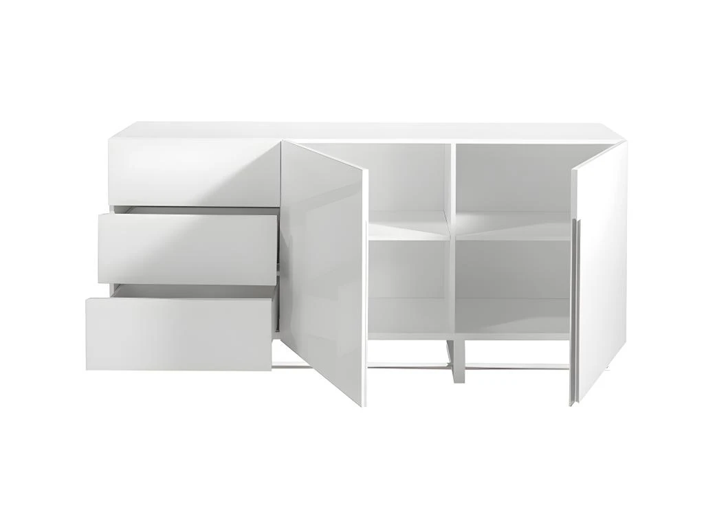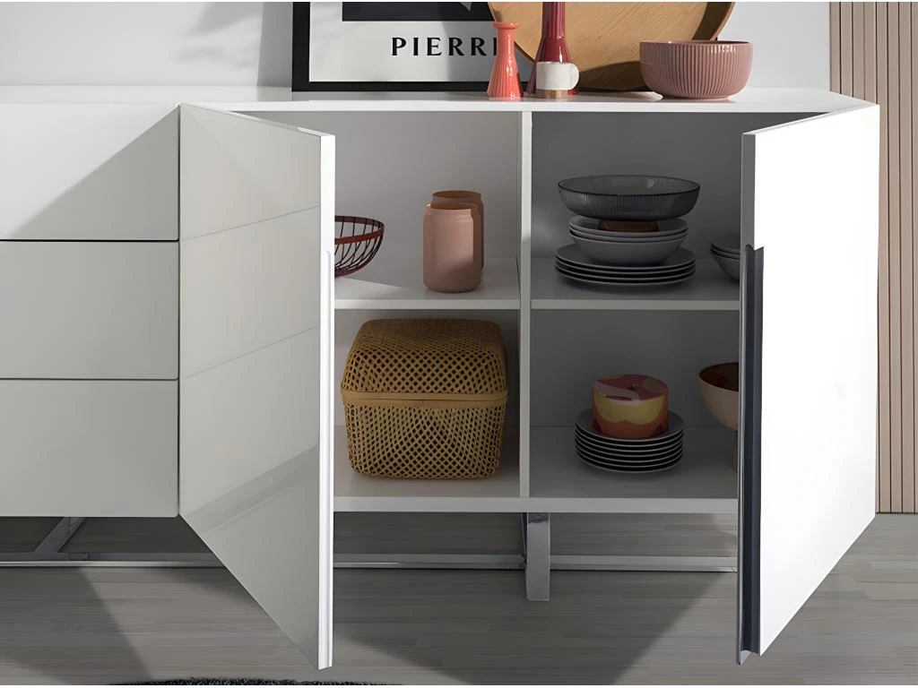 Buffet au design moderne et aux lignes simples avec une structure DM laquée en blanc brillant RAL9003 et une structure originale de pieds et de garnitures en acier inoxydable chromé 22 microns. Créez une atmosphère unique et différente avec ce buffet, et il procure une sensation d’espace et de lumière, tout en gardant tout en ordre grâce à sa grande capacité de rangement grâce à ses trois tiroirs simples et ses deux portes avec système de fermeture en douceur et étagères intérieures assorties. de MDF en laque blanche