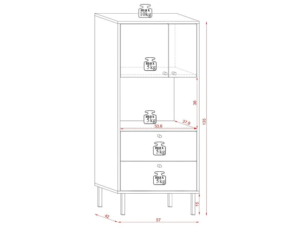 - Largeur 57 cm x Profondeur 42 cm x Hauteur 135 cm – Poids net: 36.5 kg.