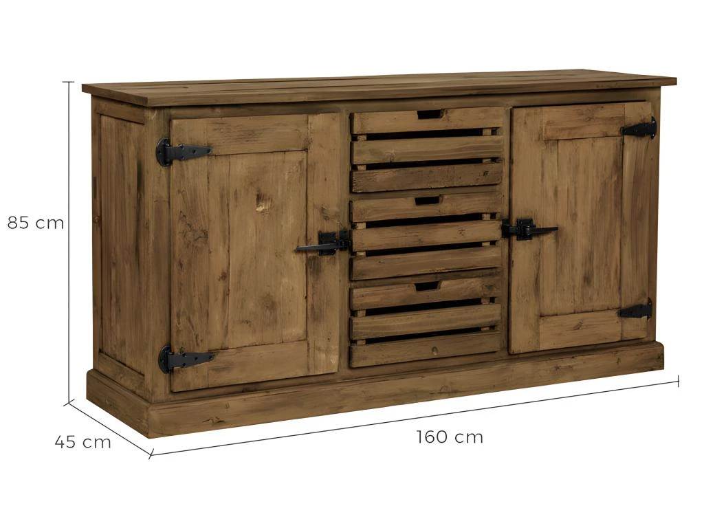 Ce grand buffet en bois recyclé mesure L 160 x P 45 x H 85 cm et comprend trois tiroirs ainsi que des étagères où mettre vos verres, vaisselles et autres effets personnels en sureté. Il offre ainsi un bel espace de rangement sans encombrer votre pièce.