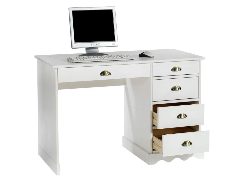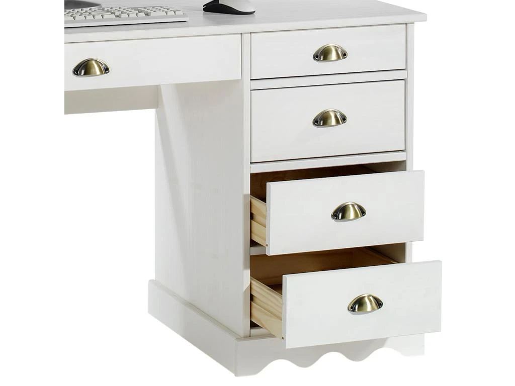 … avec son style classique est idéal pour meubler de manière élégante votre bureau. Doté de 5 tiroirs, 1 grand au centre et 4 plus petits sur le côté, il vous permettra d’organiser votre travail de façon optimale et de ranger toutes vos affaires personnelles. Les poignées en forme de coquille apportent une touche de charme supplémentaire à ce bureau et soulignent son style maison de campagne.