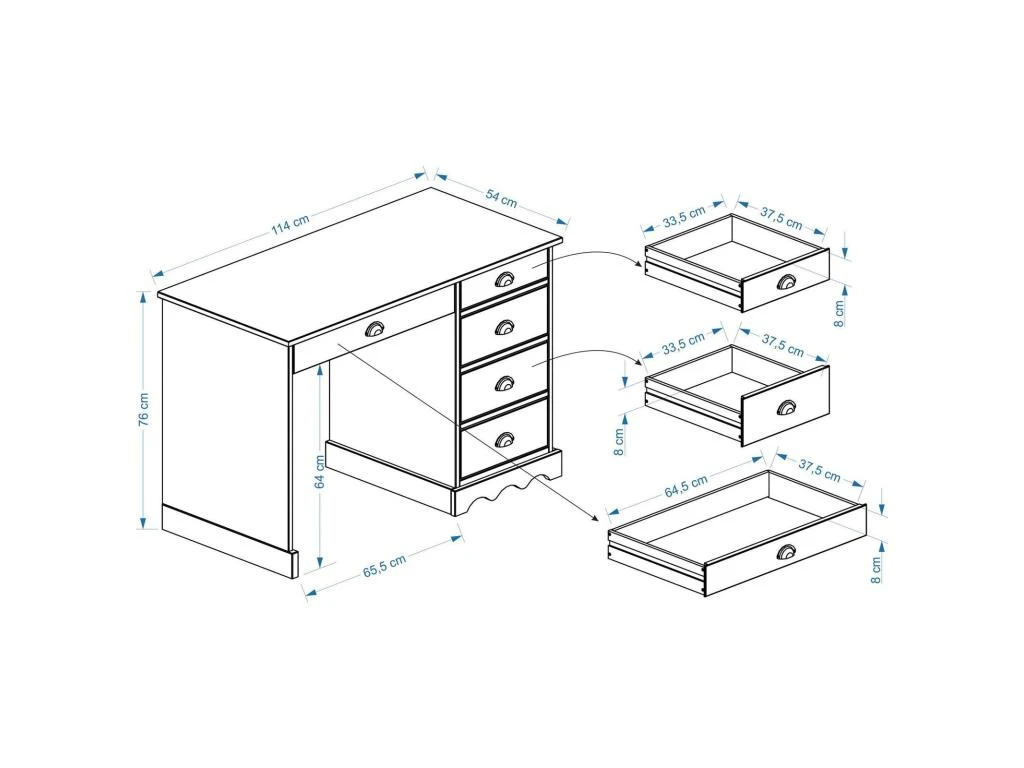 – Le bureau est fabriqué en pin massif, recouvert d’une lasure blanche.