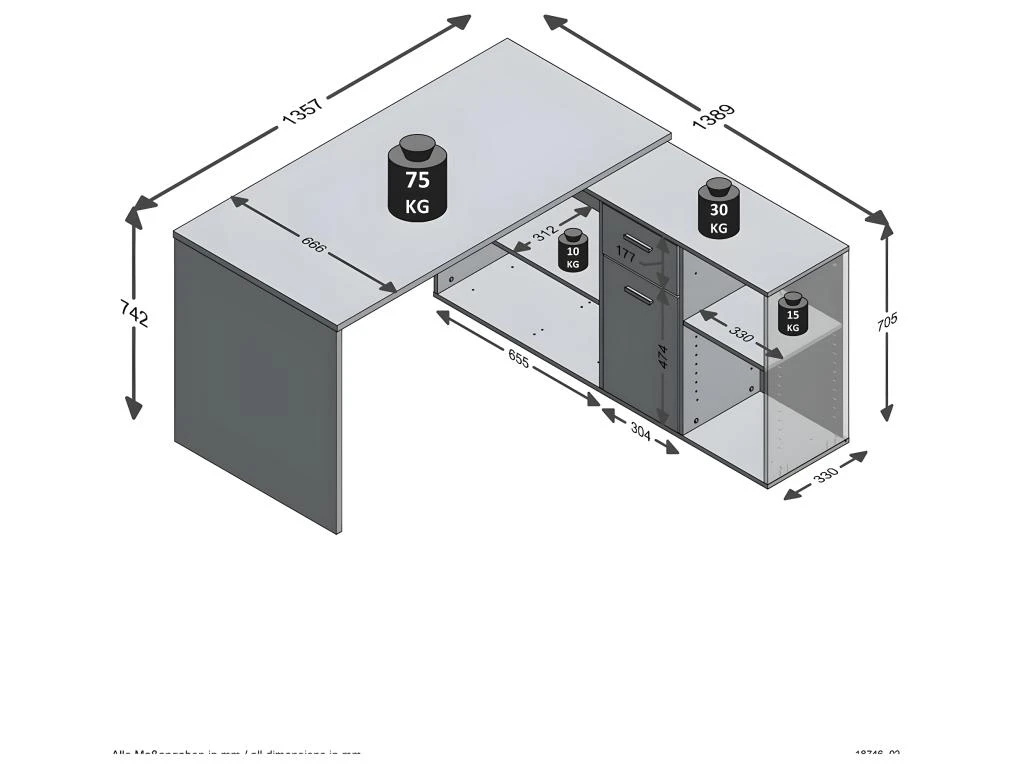 - Épaisseur des panneaux de particules du plateau et du pied latéral : 22 mm