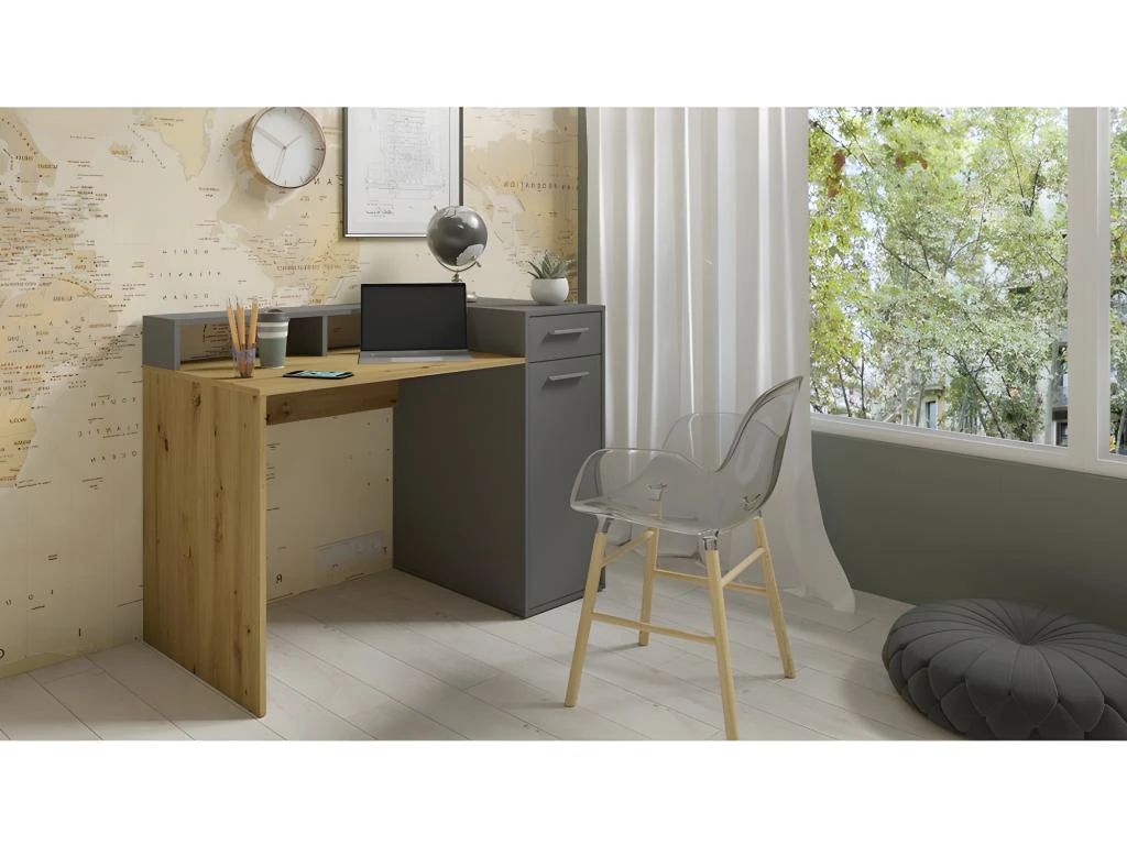 – COLORIS : Bureau couleur chêne. Caisson de rangement et support écran couleur gris.