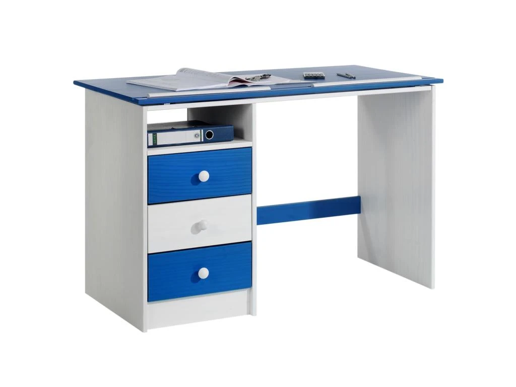 – Le bureau est fabriqué en pin massif, recouvert d’une lasure blanche et d’une lasure bleu.