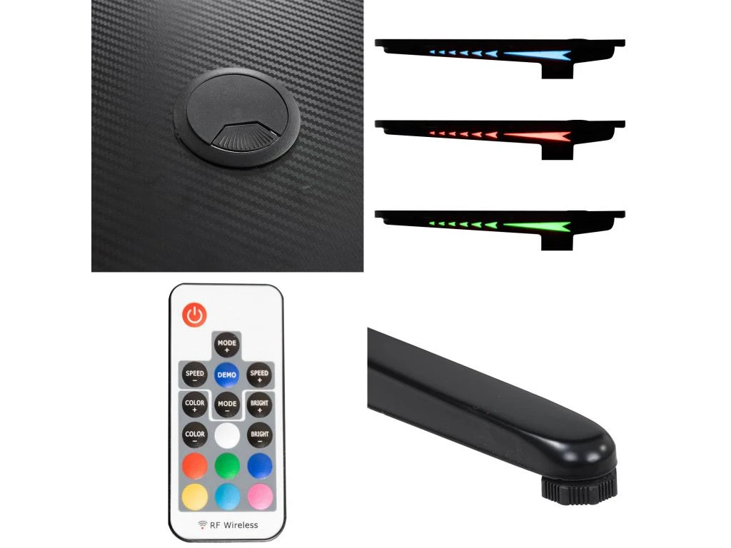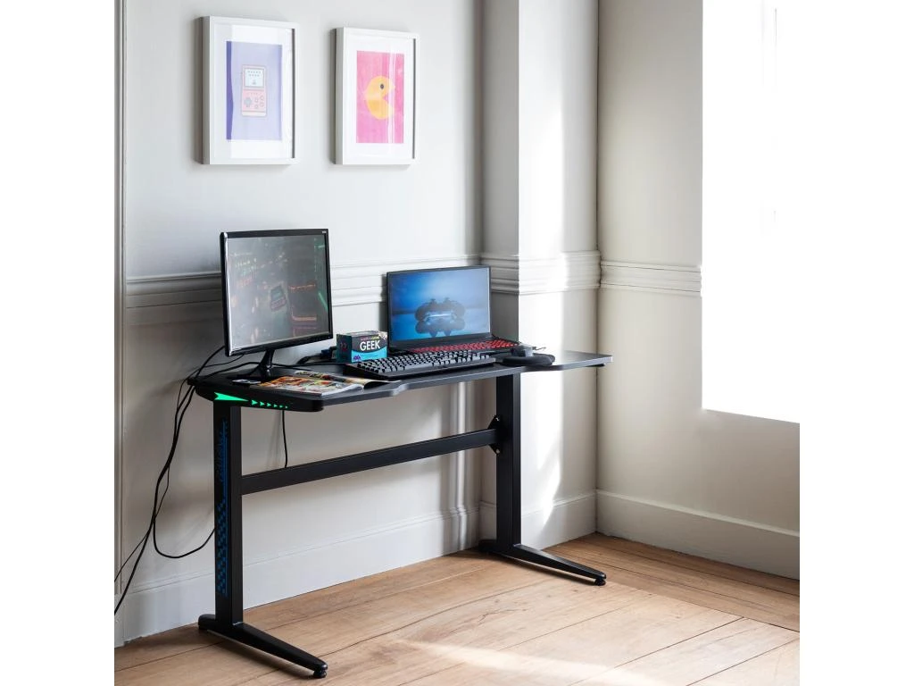 Le bureau de gamer est idéal pour tous les passionnés de jeux vidéos et d’informatique. Avec ses larges dimensions, vous pourrez y disposer jusqu’à deux écrans. Les deux sorties de câbles vous permettront d’installer facilement tout votre matériel et tous vos périphériques indispensables à votre environnement de jeux ou de travail. Pour une ambiance futuriste, il possède un éclairage à LED latéral personnalisable via une télécommande. Petit plus pour un design encore plus moderne, vous aurez la possibilité de coller des stickers sur les pieds de votre table de gamer. Alors, à vous de jouer !