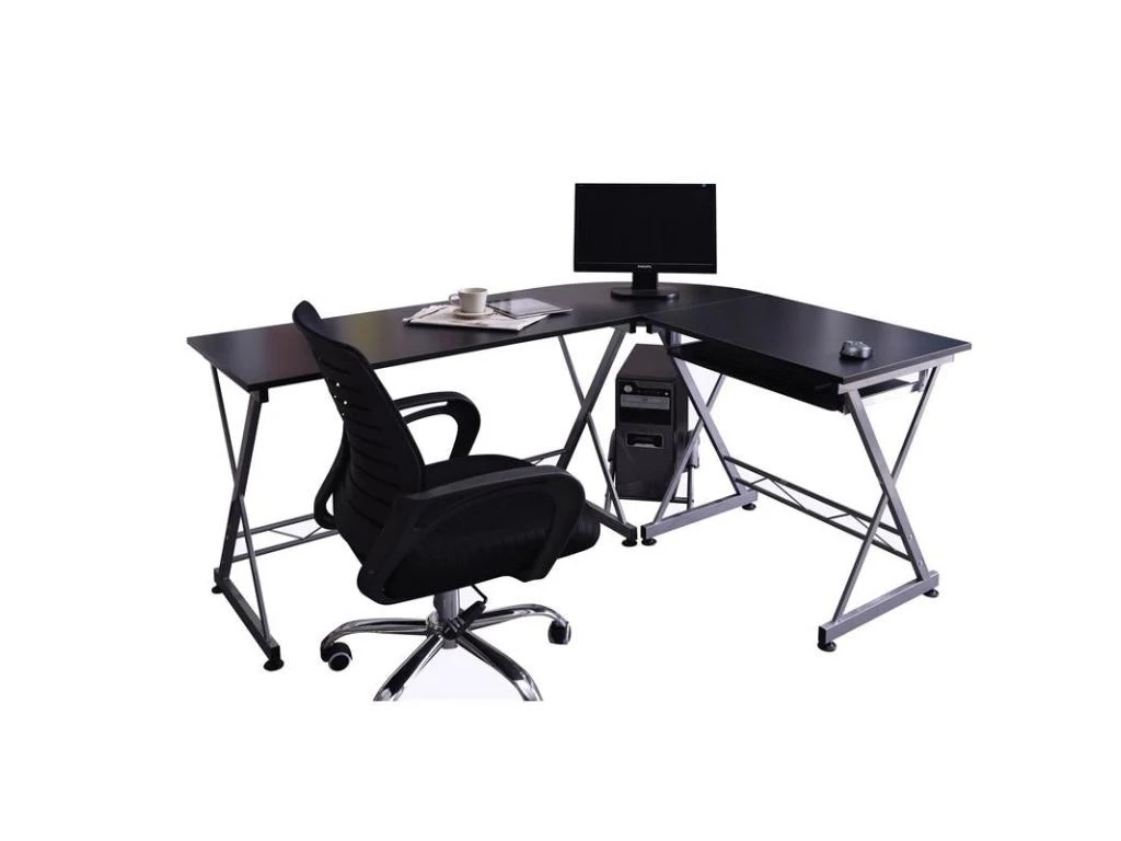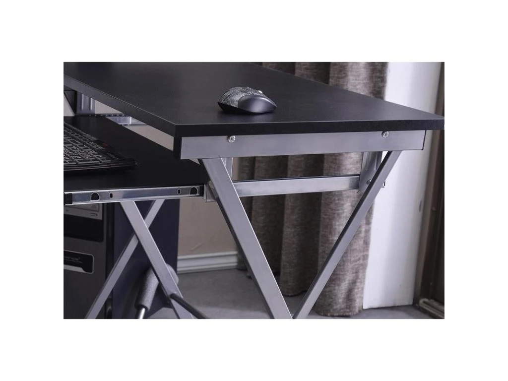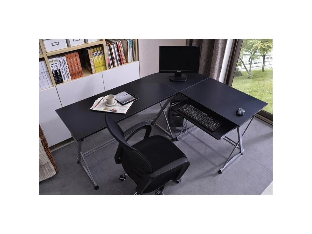 Nous sommes heureux de vous proposer ce spacieux bureau informatique d’angle noir aux lignes épurées. Vous gagnerez de la place en posant votre clavier d’ordinateur sur la tablette coulissante incluse. Ce bureau est également livré avec une tablette de rangement pour la tour centrale. La partie la plus longue du bureau peut être installée des deux côtés, ce qui permet d’aménager son espace informatique à sa guise.