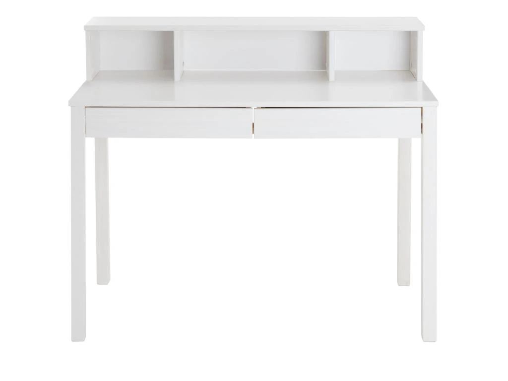 – Le bureau est fabriqué en pin massif lasuré blanc.