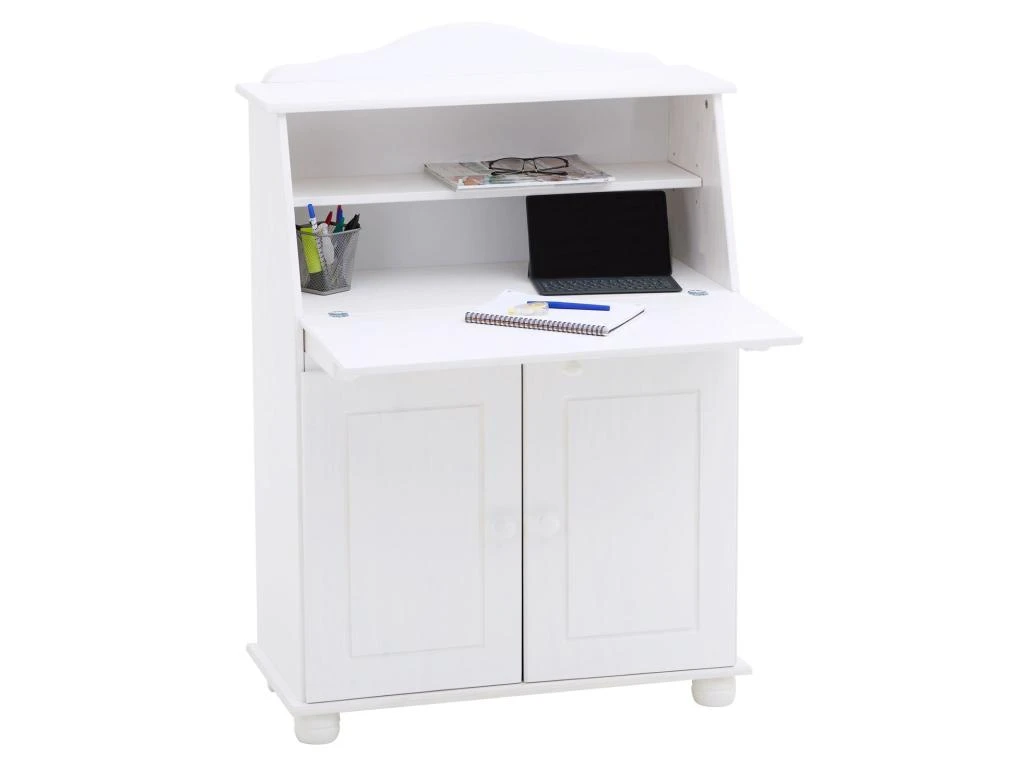– Le secrétaire est fabriqué en pin massif, recouvert d’une lasure blanche.
