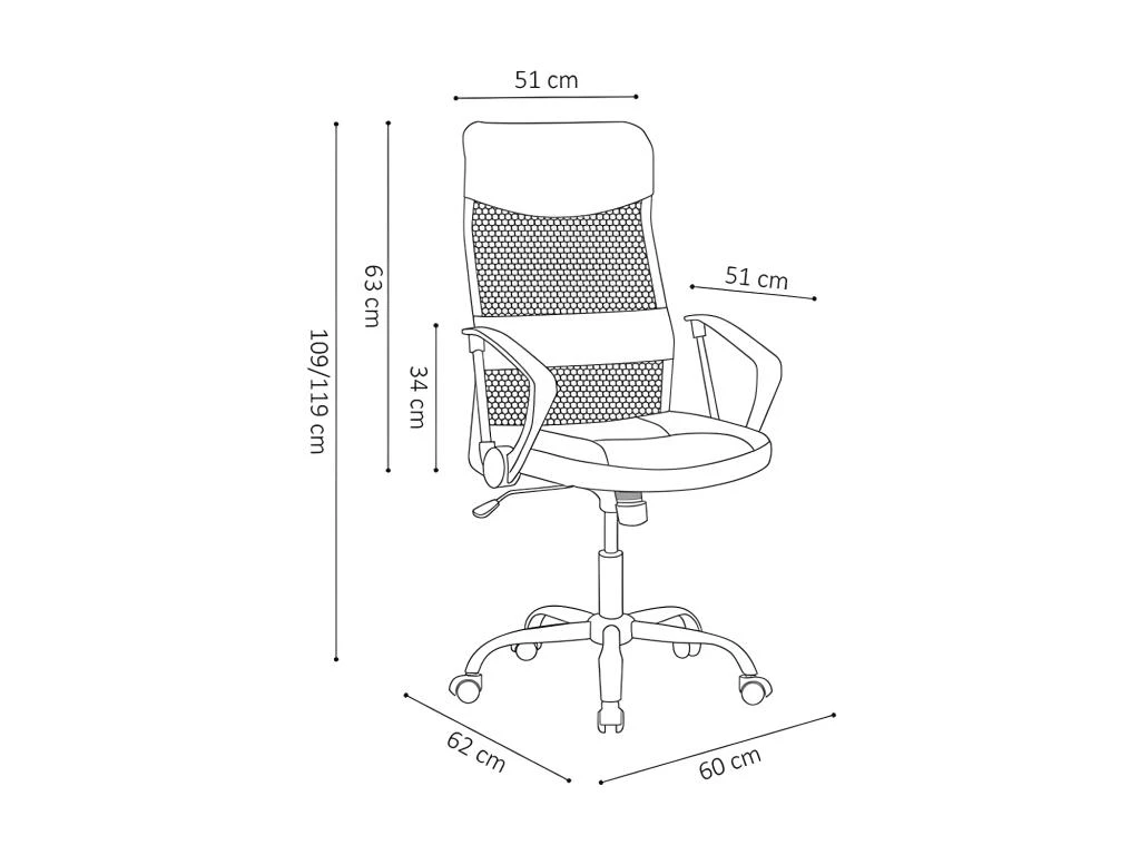 Les dimensions de cette chaise de bureau sont de H109/119 x L60 x P62 cm, ce qui la rend compacte et facile à intégrer dans n’importe quel espace de travail.