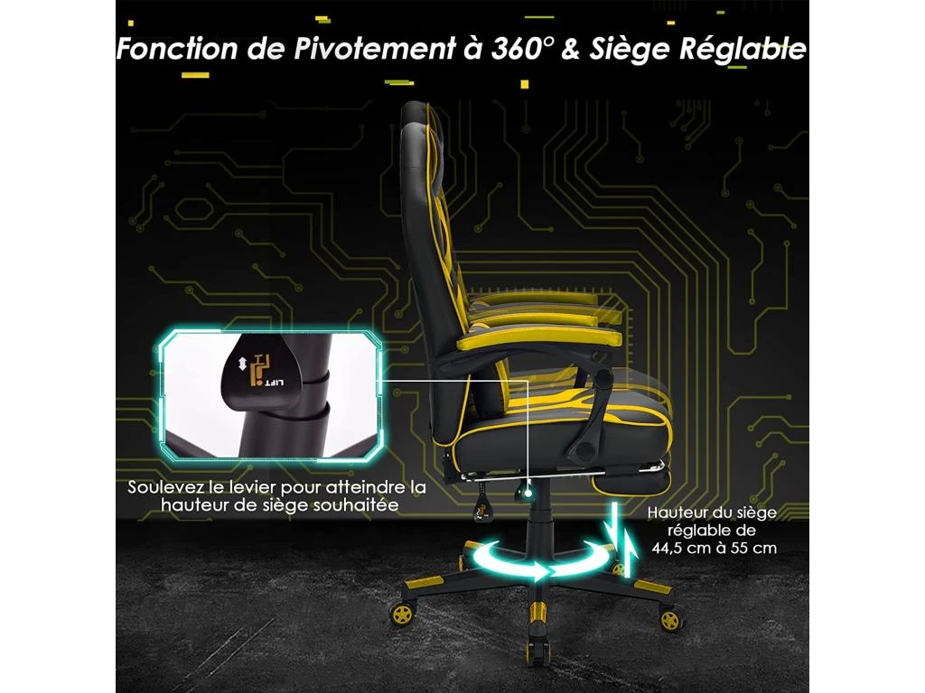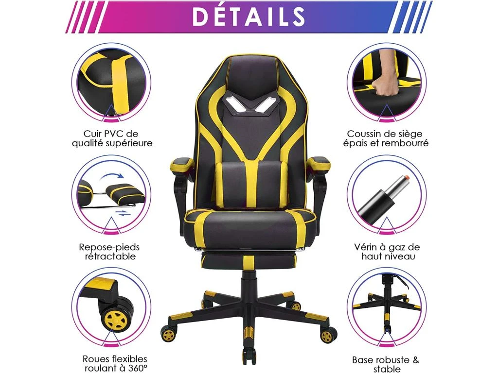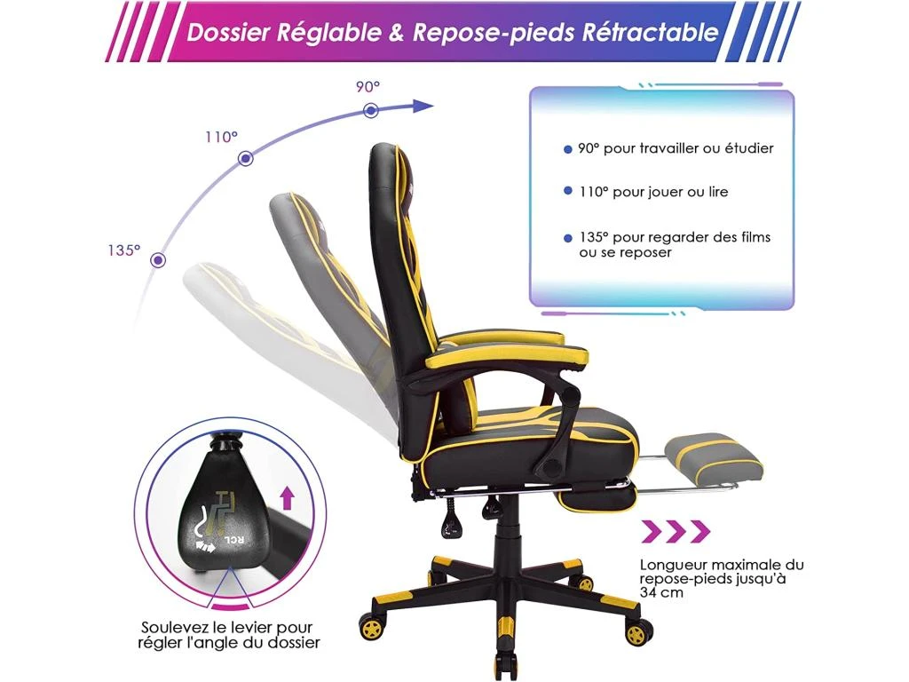 - Soutenu par une base robuste avec une tige de gaz de haute qualité, cefauteuil est robuste et suffisamment stable pour supporter jusqu’à 150 kg. Laconception ergonomique s’adapte parfaitement à la courbe du corps pour obtenirun confort optimal. Vous vous asseyez confortablement et vous vous sentirezdétendu avec un dossier, un oreiller lombaire, un repose-pieds rétractable etun épais coussin rembourré. La surface lisse en PVC est facile à nettoyer touten vous apportant un toucher doux pour la peau.