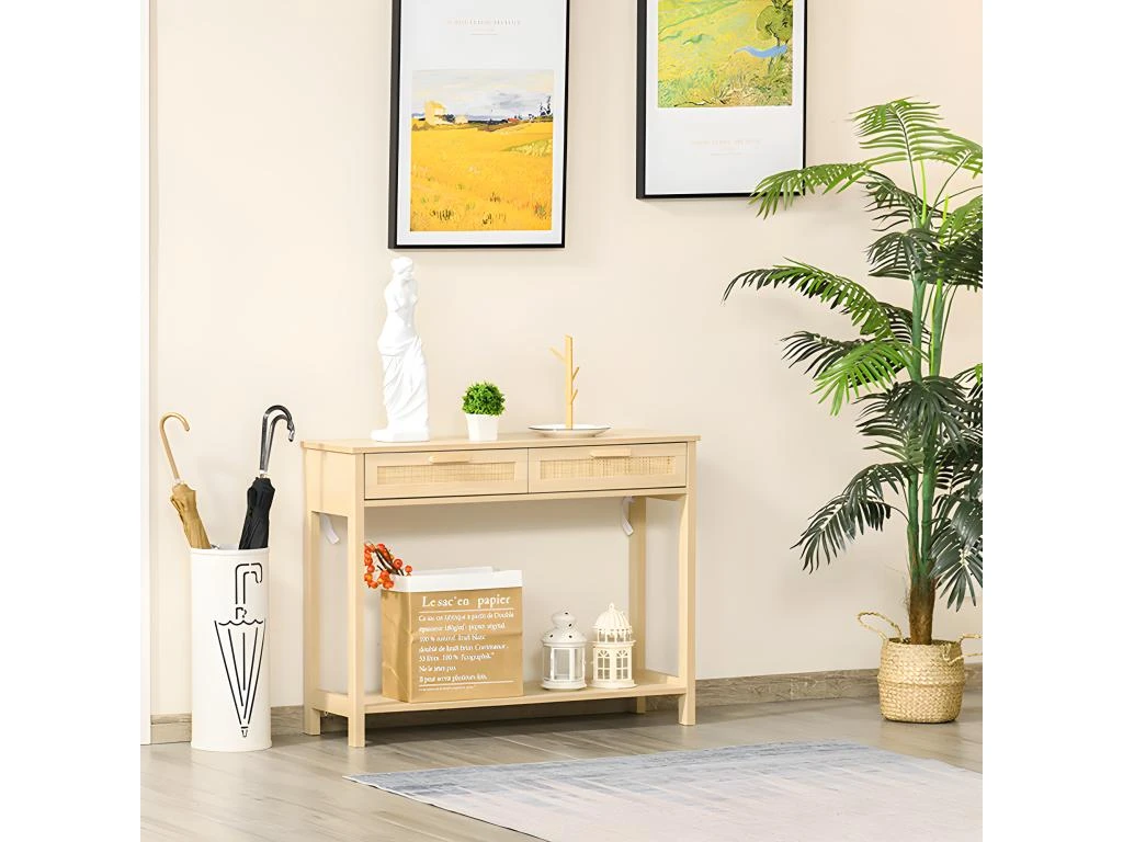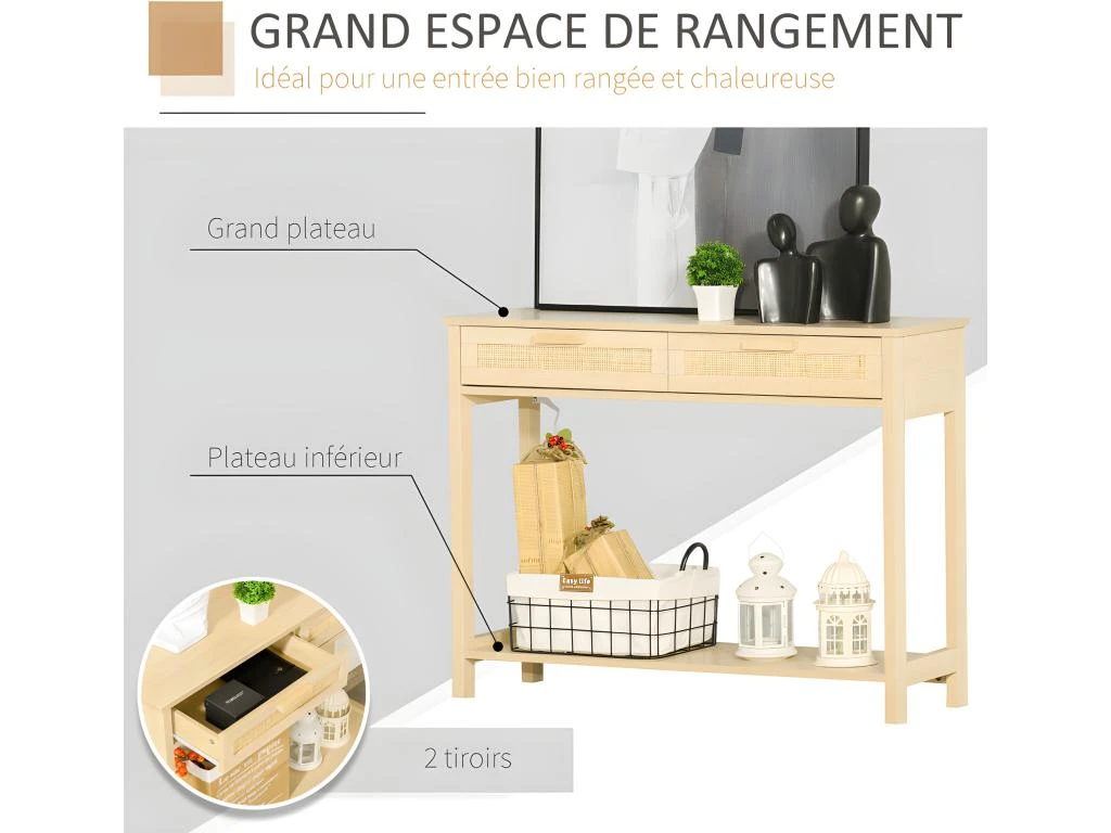 – Table console style cosy naturel mĂ©lant avec Ă©lĂ©gance l’aspect bois clair et le rotin grâce aux insertions de cannage sur les façades de chaque tiroir