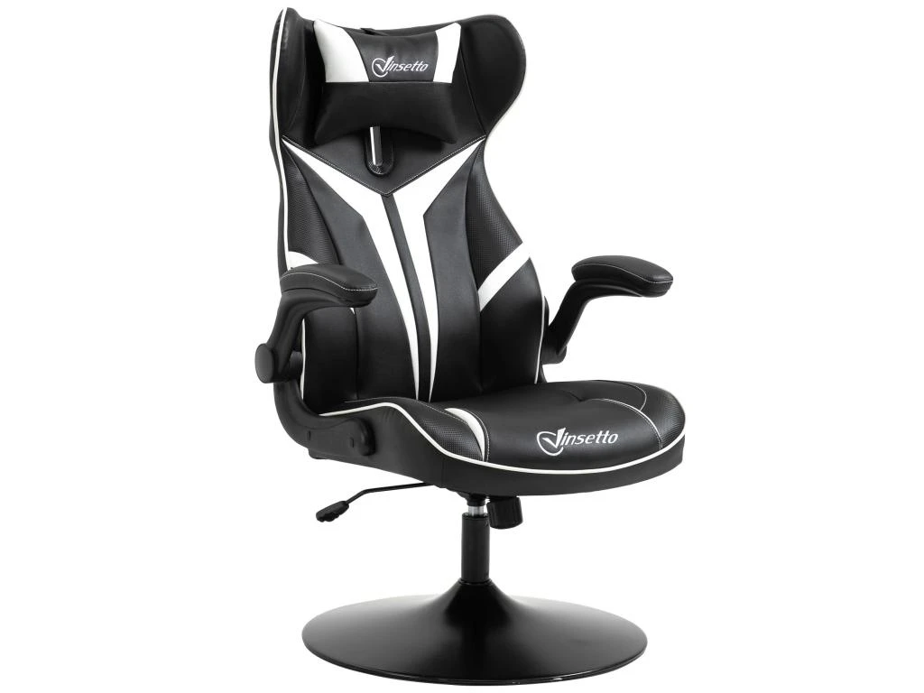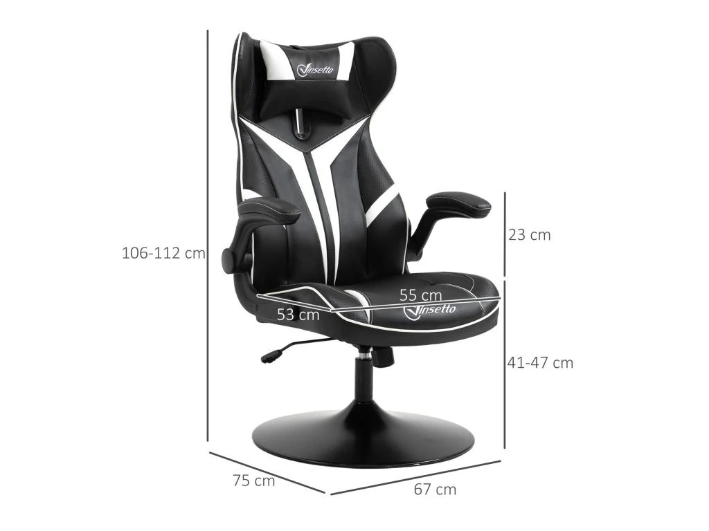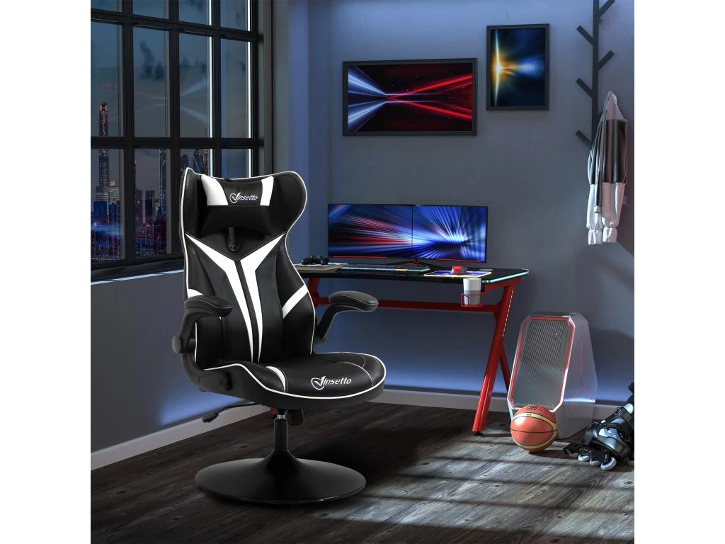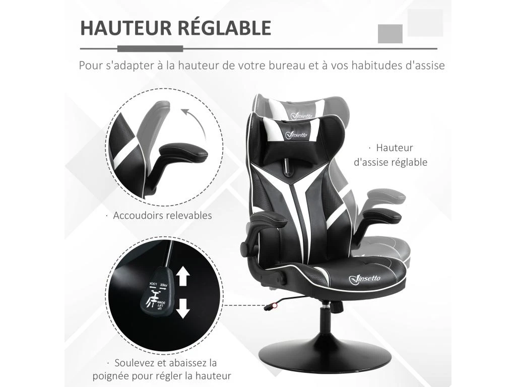 Fauteuil Gaming Base Ronde Métal Pivotante 360° Hauteur Réglable Tétière Accoudoirs Relevables PVC Blanc Noir