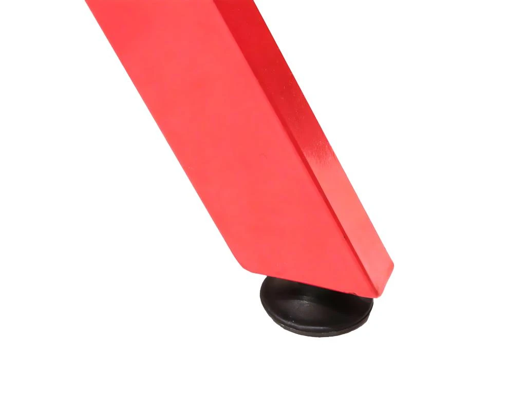 Structure en acier, coloris rouge. Armature plateau en panneau de particules, finition revêtement mélaminé.