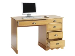 Bureau COLETTE Rangement Avec 5 Tiroirs Et Plateau Avec Corniche, En Pin Massif Lasuré Couleur Miel