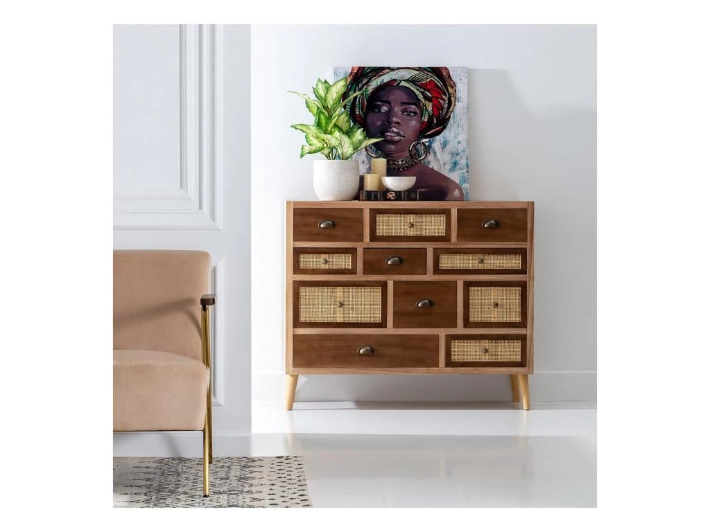 Toute la chaleur du bois est ici soulignée par des façades de tiroir en cannage tressé, ces tiroirs sont mis en relief par des poignées fantaisie issues de meubles de métiers.