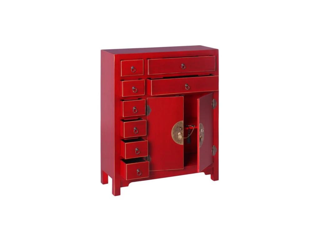 La teinte rouge se marie à la quincaillerie dorée, parfaitement raccord avec le style oriental de ce meuble multifonction sobre et élégant.