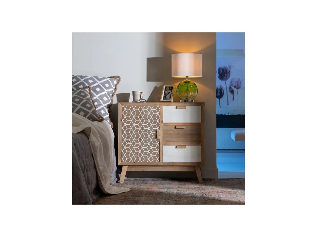 Bois de Pin à la teinte délavée et panneau à motifs géométrique pour ce meuble d’entrée 1 porte 3 tiroirs très nettement inspiré du mobilier Scandinave.