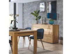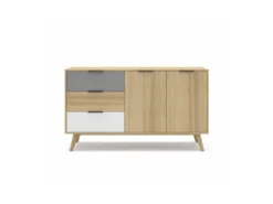 Son design épuré et ses finitions mélant laque blanche et décor chêne clair lui donnent un style contemporain.