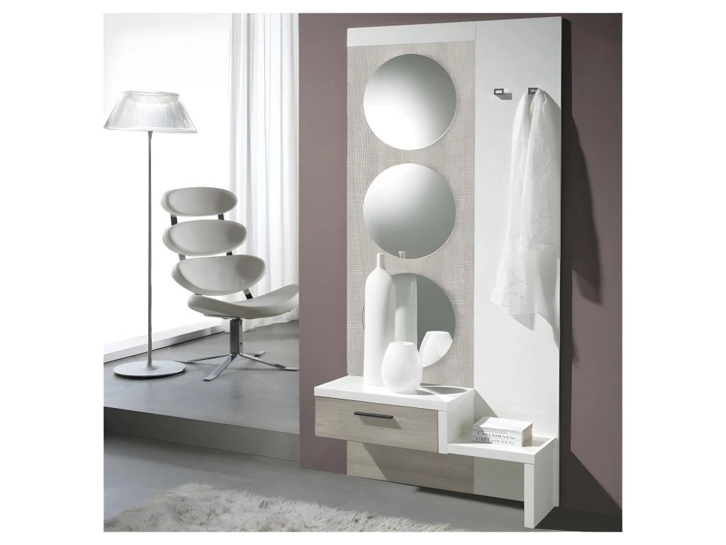 Magnifique meuble d’entrée contemporain et design laqué blanc avec décor Chêne clair.