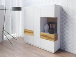 Buffet Haut KILES Trois Portes Avec LED. Coloris Blanc Et Chêne. Style Design