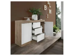Buffet 2 Portes 3 Tiroirs Blanc Laqué Brillant/Chêne Naturel – SPEZIA