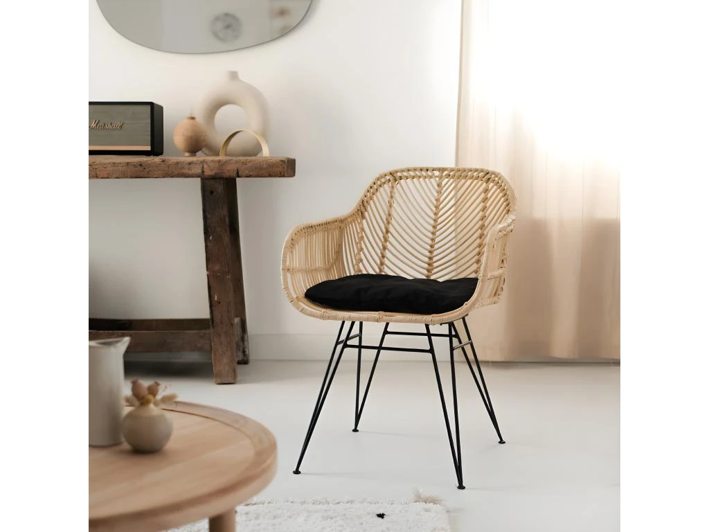 Sa coque en rotin travaillĂ©e main, joue les mix&match, entre exotisme des matières et modernitĂ© des courbes… Et pour plus de confort, le fauteuil de table Nunuhai est Ă©quipĂ© d’un petit coussin noir en tissu polyester.