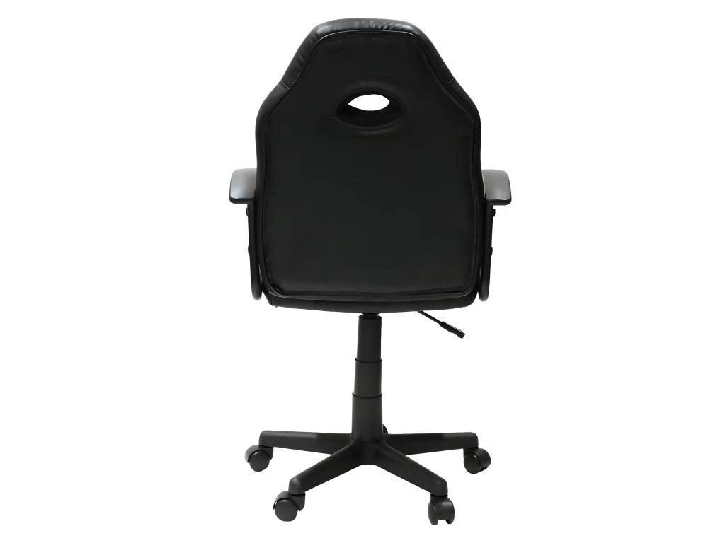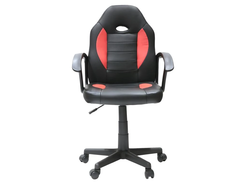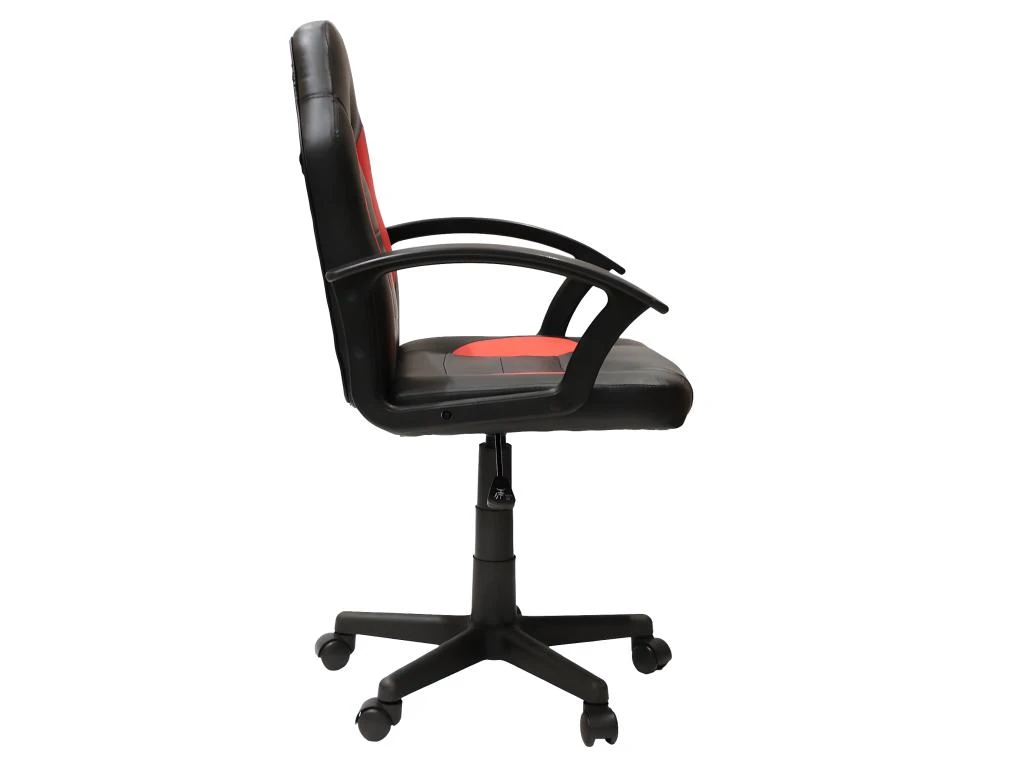 Piétement plastique coloris noir, monté sur roulettes multidirectionnelles. Assise et dossier revêtus de simili coloris noir et rouge. Rembourrage en mousse. Hauteur réglable. Hauteur d’assise : 42-54 cm