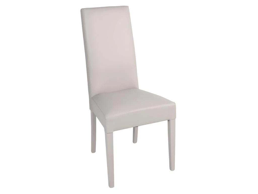 Piétement en hêtre massif laqué gris clair. Revêtement assise et dossier en simili cuir coloris gris clair. Chaises livrées montées pour une utilisation immédiate.