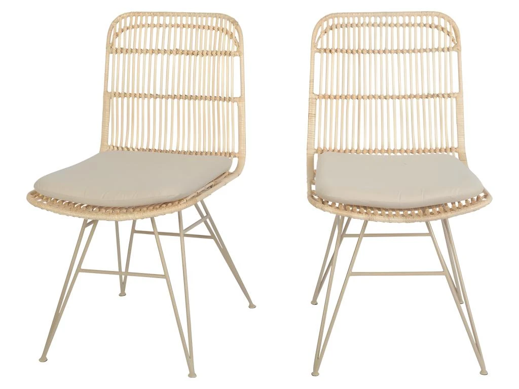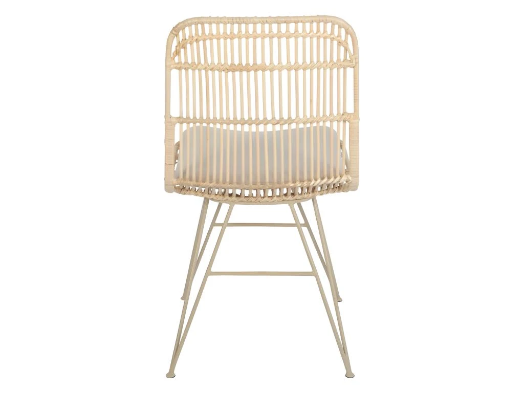 La couleur naturelle du rotin, présent sur l’assise et le dossier au design arrondi et aux motifs délicatement ajourés, forme un duo très harmonieux avec le piétement en métal beige. Comme nous, vous apprécierez la luminosité de l’ensemble !